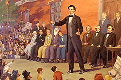 Enrollment: 39 in the College, 257 Academy, 53 Female Collegiate Dept. On October 7th, 1858, Abraham Lincoln and Stephen Douglas debate the moral issues of slavery and other political issues of the day on the steps of Old Main before a crowd estimated as high as 20,000. The debate is the fifth of seven debates held throughout the state of Illinois in preparation for the 1858 United States Senate elections. Of Douglas's position, Lincoln said: "He is blowing out the moral lights around us when he contends that whoever wants slaves has a right to hold them." Although Lincoln is narrowly defeated by Douglas in the Senate election, his performance during the debates win him national fame, influencing his nomination as the Republican candidate for President in the 1860 election. Jonathan Blanchard leaves Knox College. Presbyterians now hold the majority in the college's administration. Five candidates for President had been turned down when the board, with a vote of 13-11, narrowly appoints Dr. Harvey Curtis, a Presbyterian Minister from Chicago.