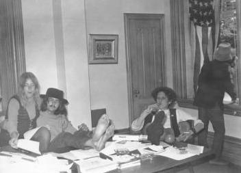 The next two years would see many more protests on the lawns and in the halls of Old Main. On Election Day 1968, Knox students reenacted Governor George Wallace's last stand for segregation, blocking Old Main's west doors and staging a mock-lynching on the South Lawn. In 1970, Old Main took center stage again when the group, "The Students Are Revolting," served Deans Sanville and Salter an eviction notice and took over the historic building on Friday, May 15. It was a peaceful demonstration against the Vietnam War that lasted until the early hours of the weekend. (Photo of sit-in at top right.)