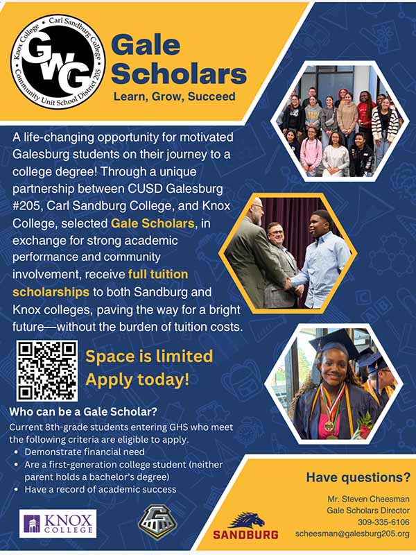 Each year up to 10 students are selected, and they join other cohorts to participate in summer enrichment and academic preparation, community service, and special skill-building experiences. Students who complete the program in high school receive tuition-waiver scholarships toward the completion of associate's and bachelor's degree programs at Carl Sandburg College and Knox, respectively. Highly academically successful students at Galesburg High School may qualify for direct enrollment at Knox College.