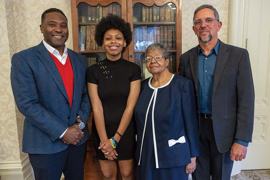 President C. Andrew McGadney, Elizabeth Eckford, and Eric Pleschner, Charles A. Becker Foundation president, celebrate the first Elizabeth Eckford Scholarship for Peace and Justice Studies, which was awarded to Tamia Ware ’26 (second from left). Eckford, one of the students who integrated Arkansas schools as a member of the Little Rock Nine, attended Knox for one year. The Charles A. Becker Foundation is funding the scholarship, which provides $10,000 over four years, in her name.