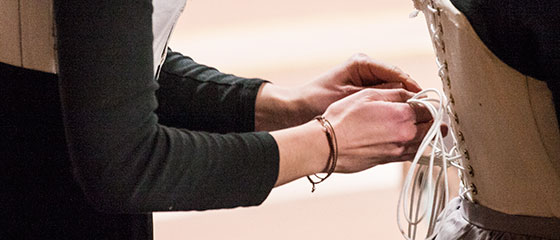 Two of the show's lead actresses, Rose Dolezal and Grace Moran, were enrolled in the Period Style Acting class while participating in the production. Taught by Elizabeth Carlin Metz, Smith V. Brand Endowed Chair in Theatre Arts, the class gave students the opportunity to put into practice what they were learning in the classroom. Below, the two actresses help each other with their corsets as they learn to move naturally in period costumes.