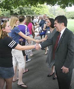 Photo, right. While at Knox, Attorney General Madigan also met with classes and, below, joined in the College's annual "Pumphandle," a traditional all-campus greeting line held every year before the start of classes.
